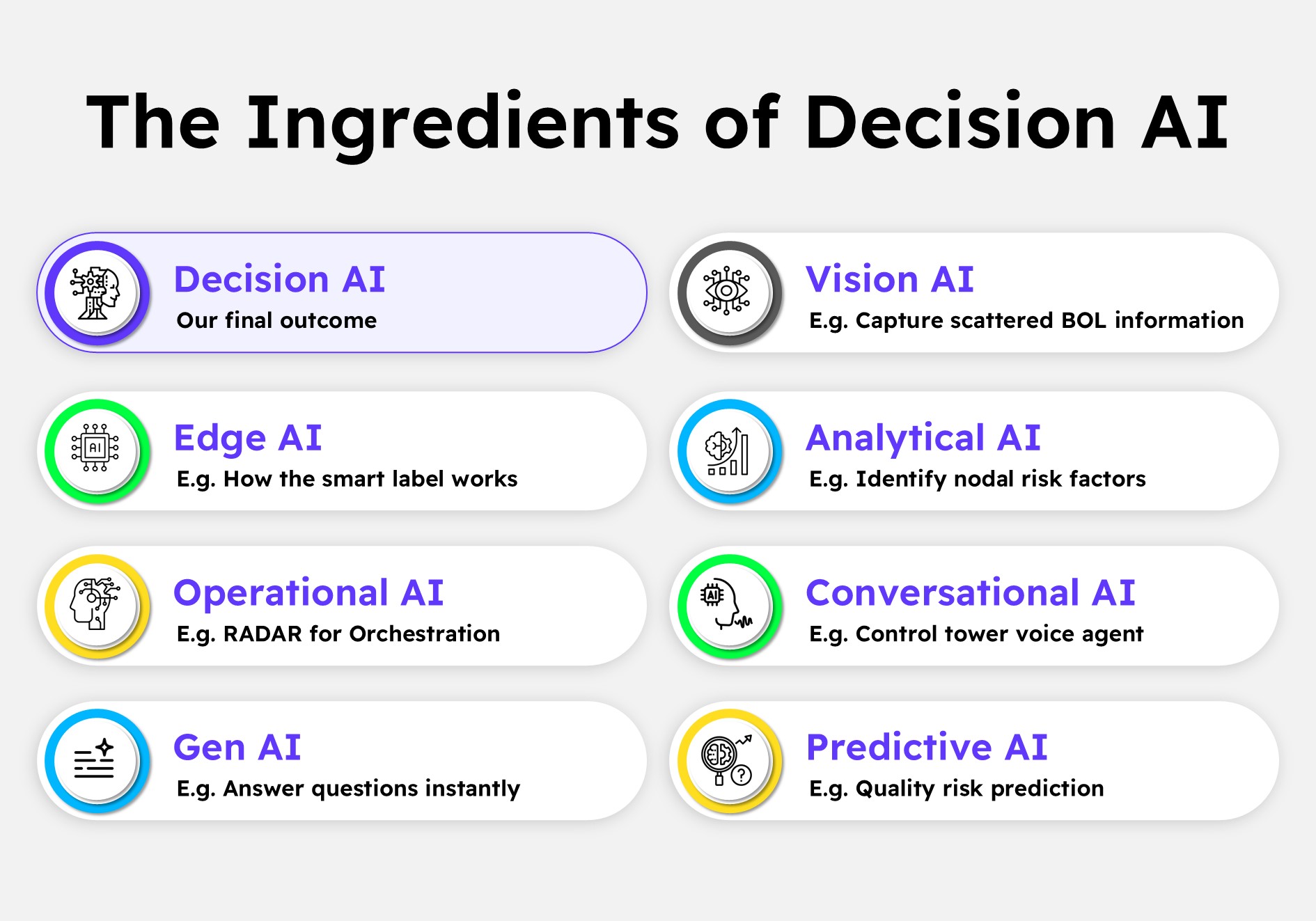 Supply chain visibility platforms generate constant signals, but most cannot translate those signals into decisions. Decklar’s architecture closes this gap with eight types of AI that work together to interpret, predict, and act in real time. Each AI pillar plays a distinct role, but their true value emerges when they operate as a unified decision engine.